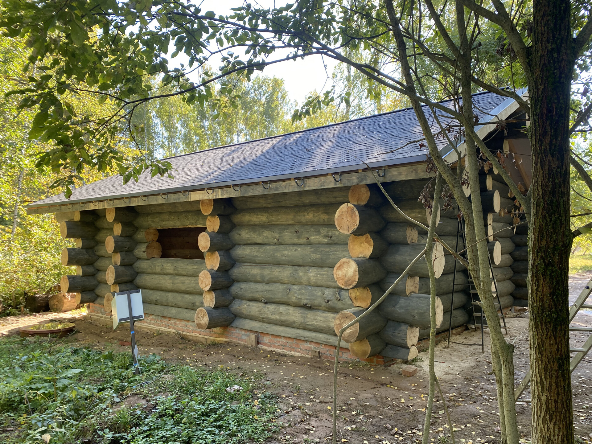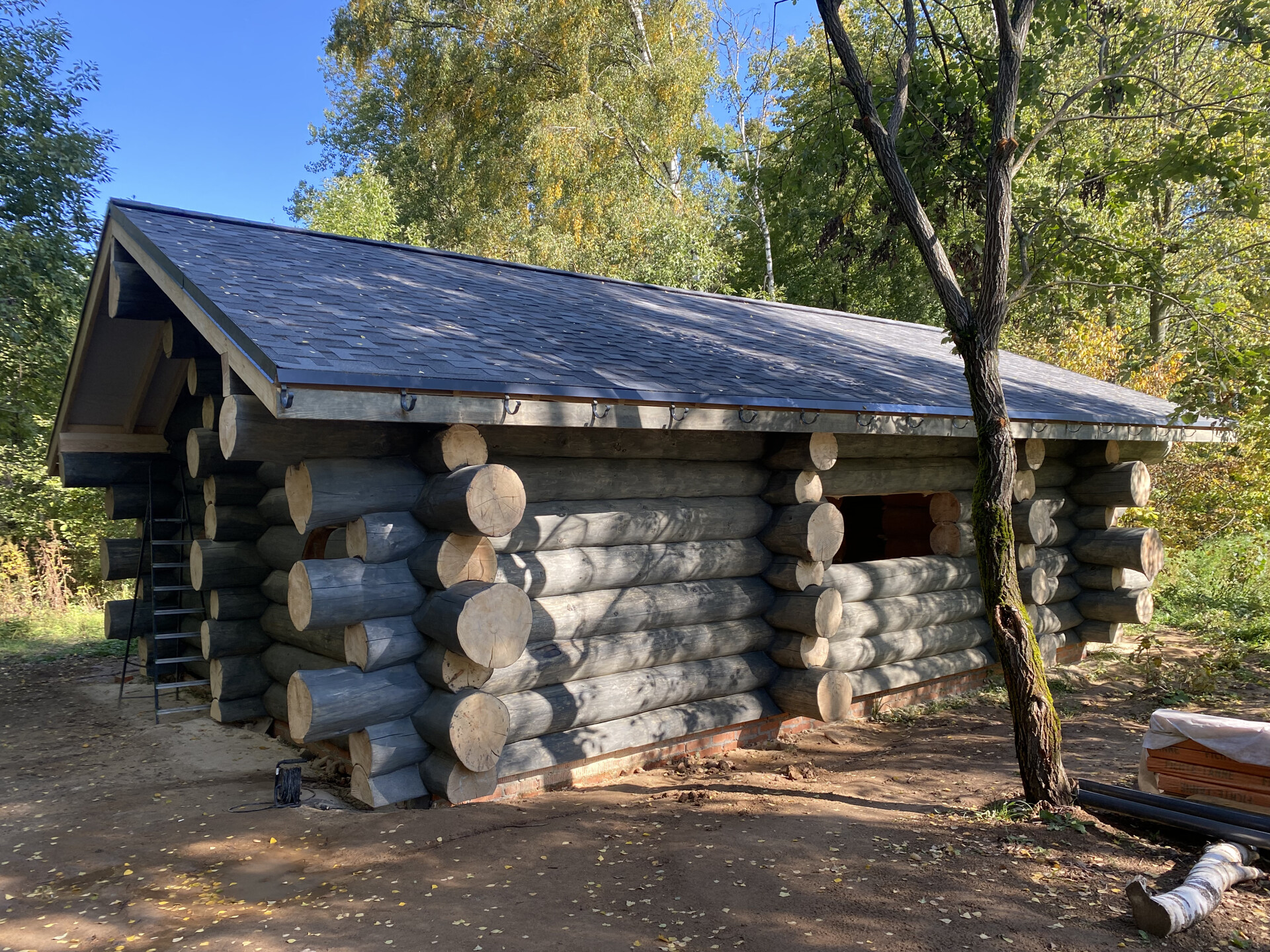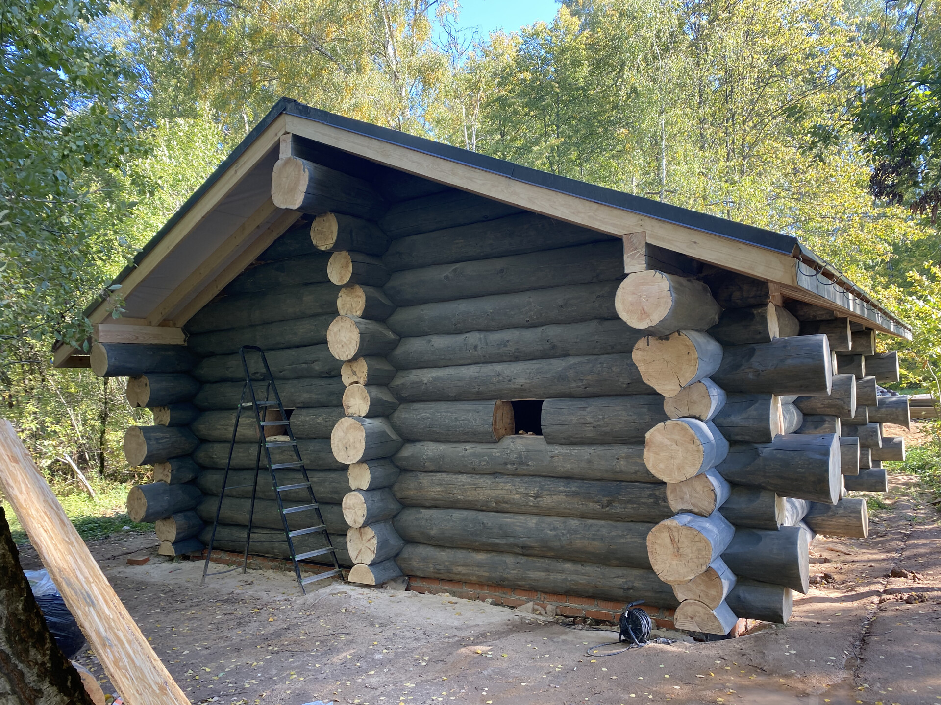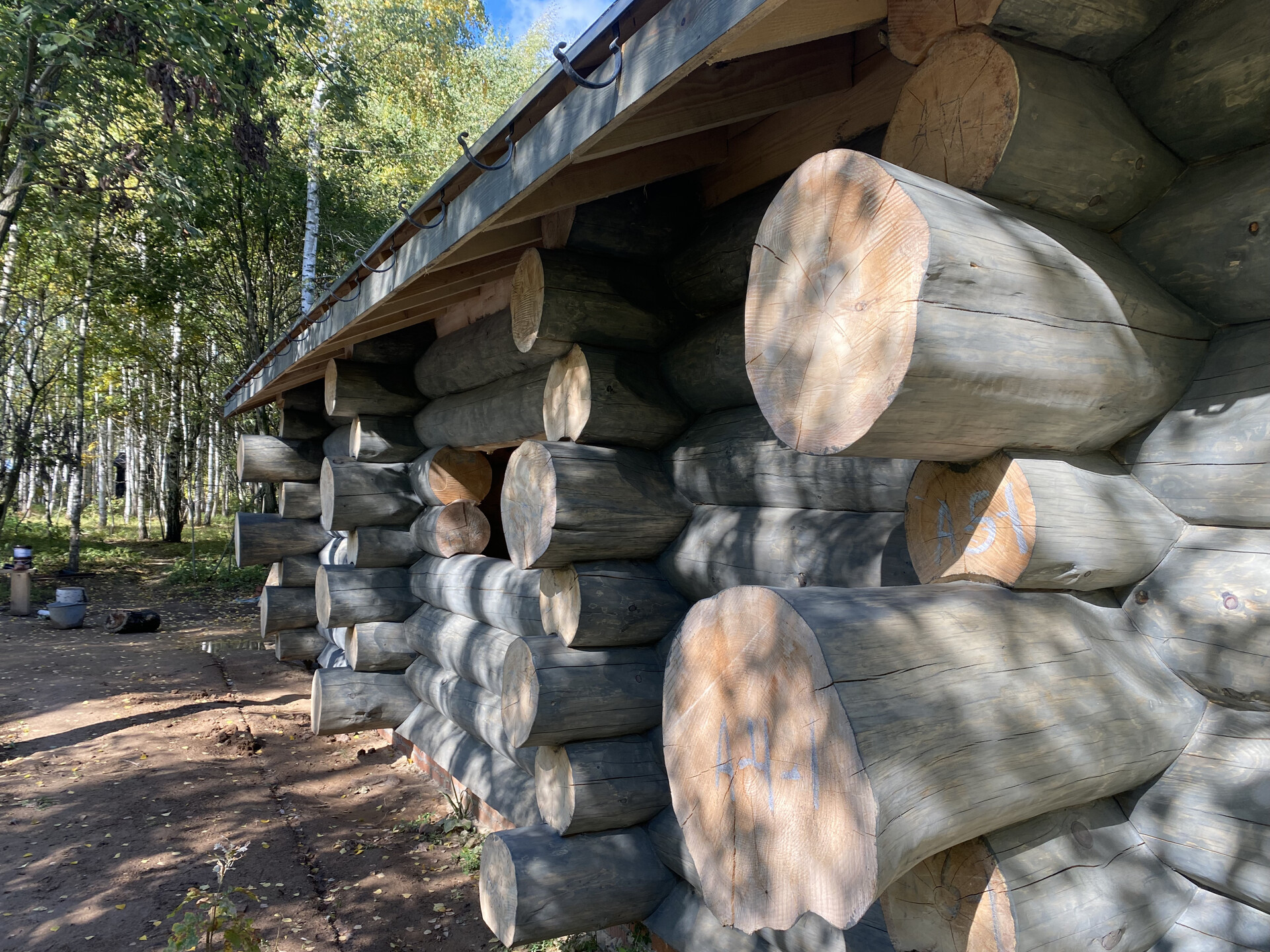 Баня 45 кв м, сибирский кедр 25-45 см с выходом на пирс к пруду. Недостроена.