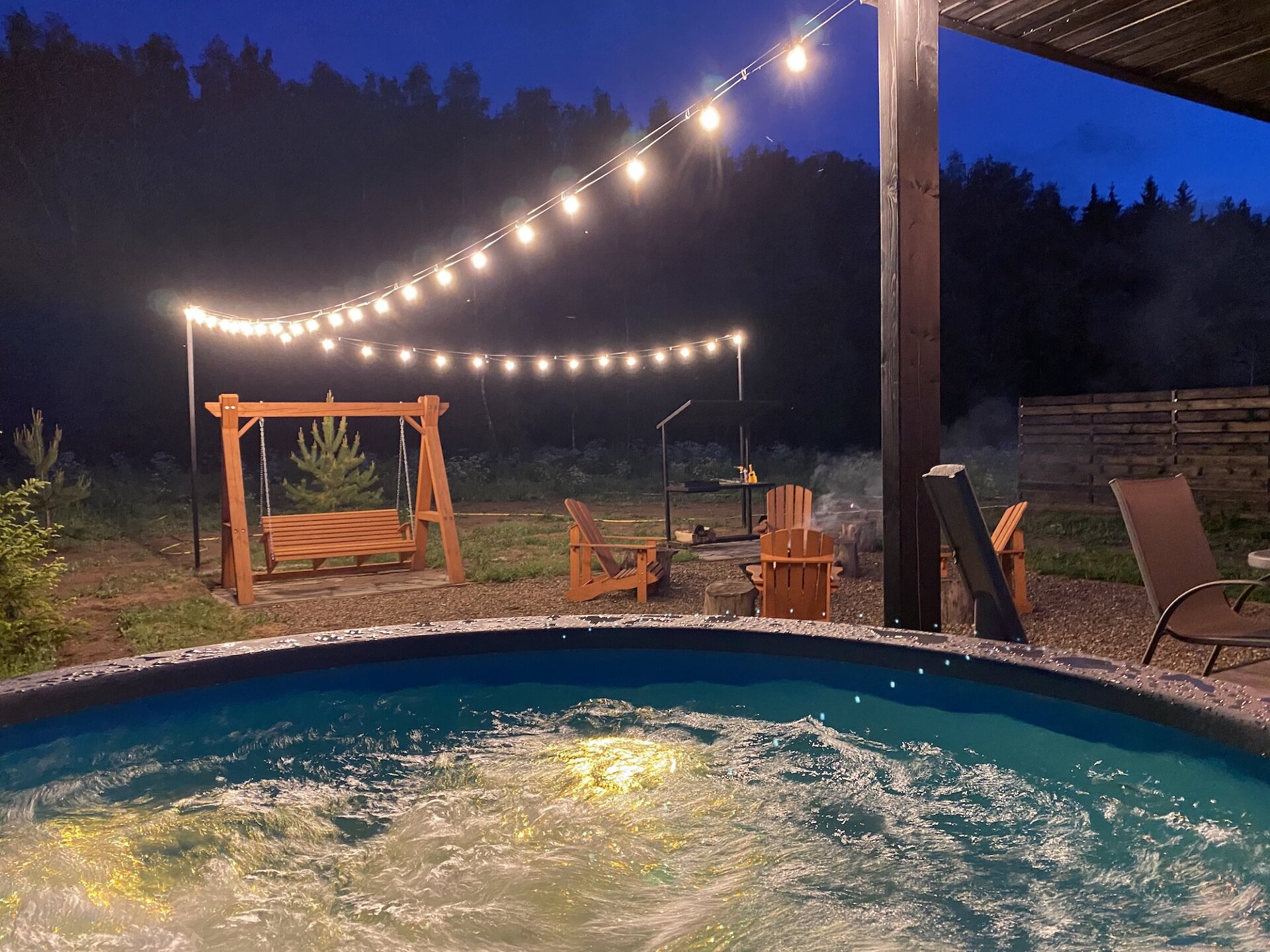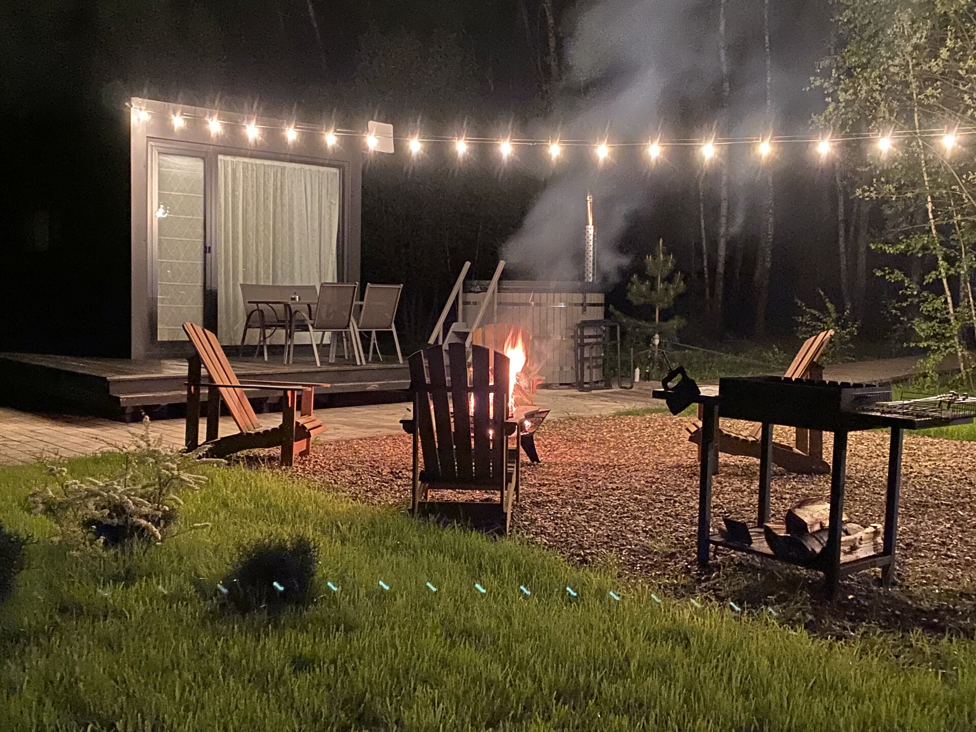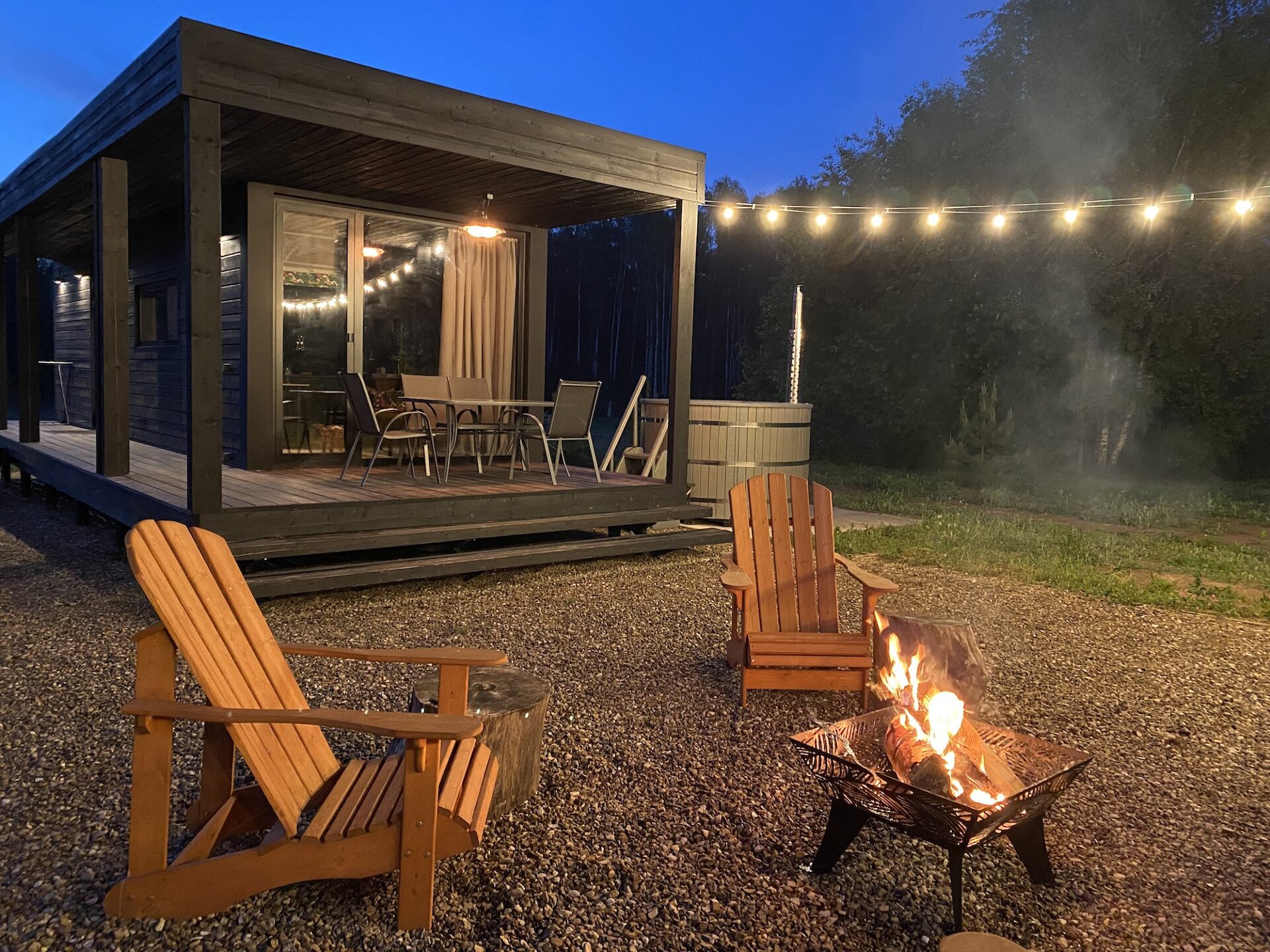 На террасе комплект мебели на 4 человек, возле каждого домика зона барбекю (костровая чаша, 4 деревянных кресла Адирондак, мангал с принадлежностями, качели