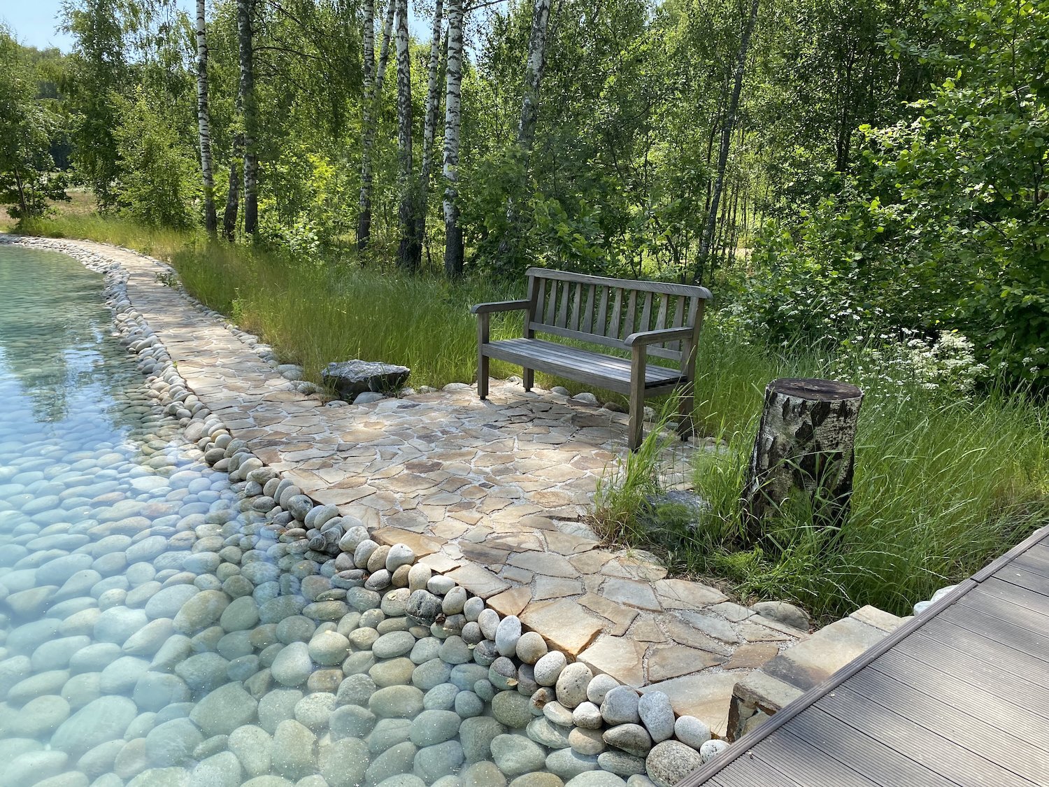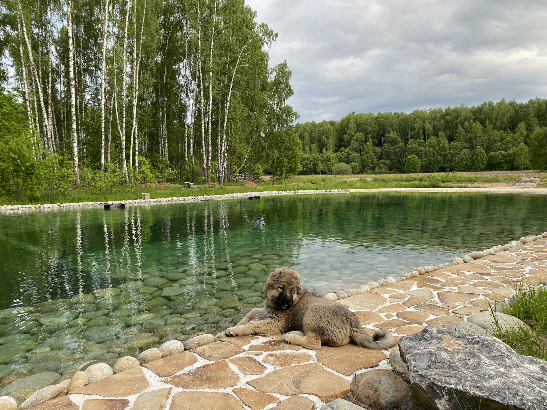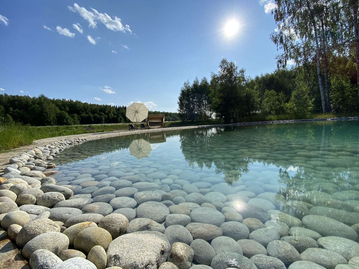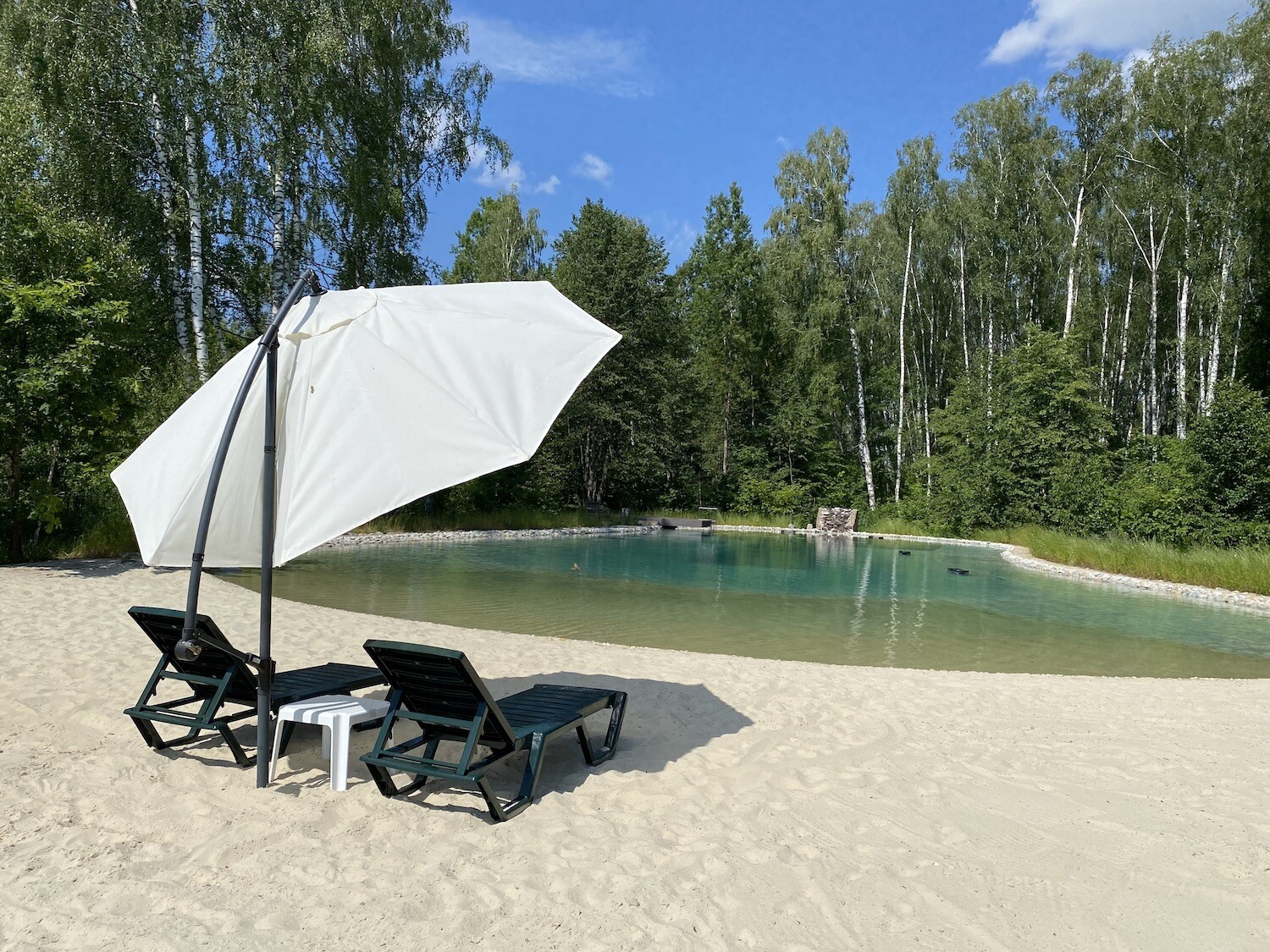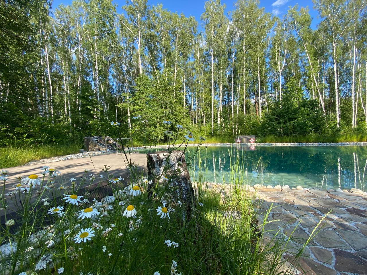 Пруд 1000 кв м, утопает в лесу. Пирс для ныряния, водопад с подсветкой, система фильтрации воды. Пляж из кварцевого песка. Зонтики, шезлонги. Глубина 0,5 - 3 м.
