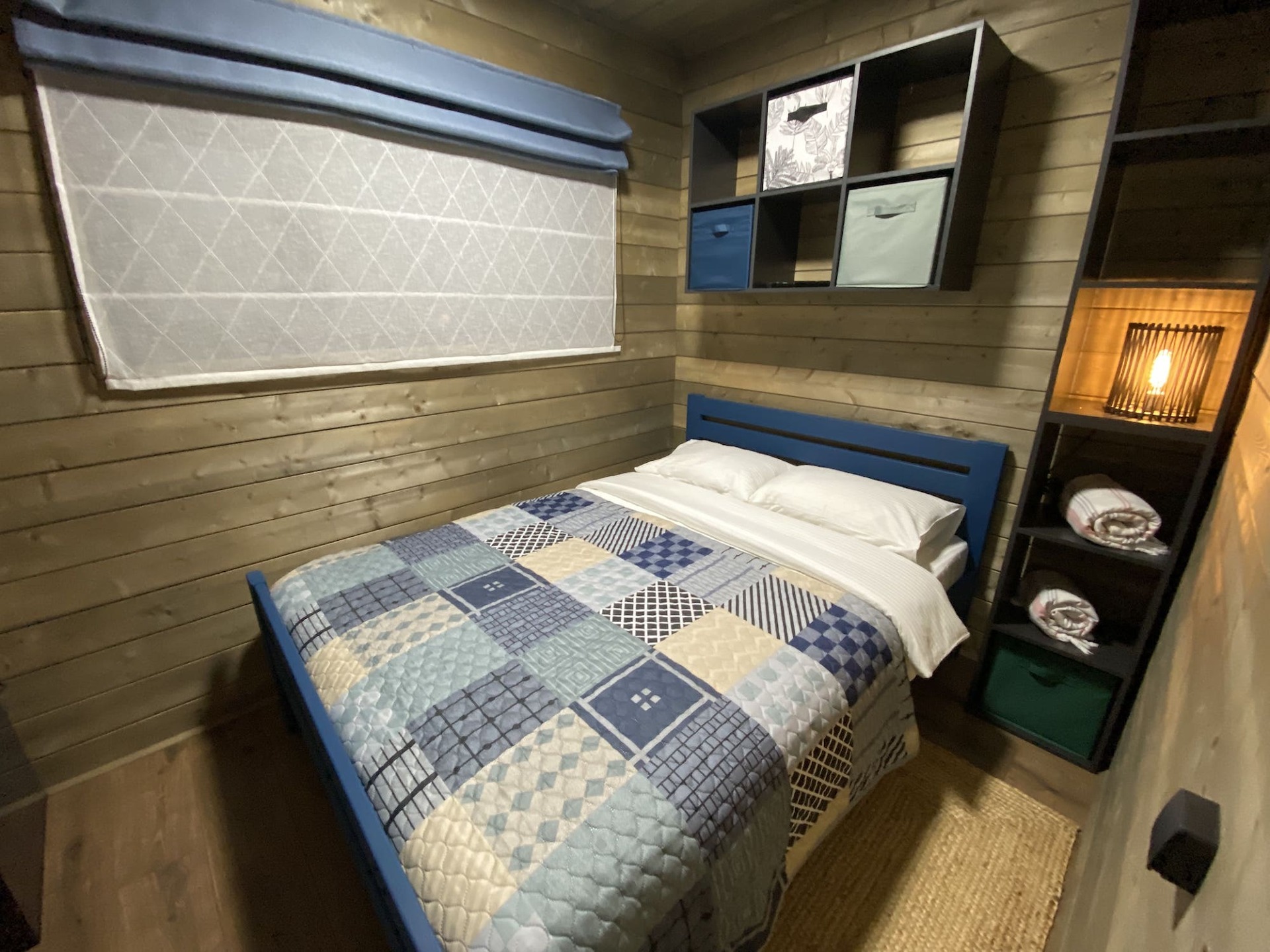 Спальня: 2-х спальная деревянная кровать, ночной светильник, полки и плечики для одежды